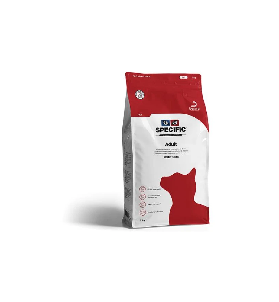 Specific Adult FXD is een complete en uitgebalanceerde voeding voor volwassen katten. De beperkte energiewaarde zorgt voor het behoud van het ideaal lichaamsgewicht. Daarnaast is de voeding rijk aan Omega-3 vetzuren die zorgen voor een gezonde vacht en huid. Tevens zorgen de Omega-3 vetzuren voor het behoud van soepele gewrichten.